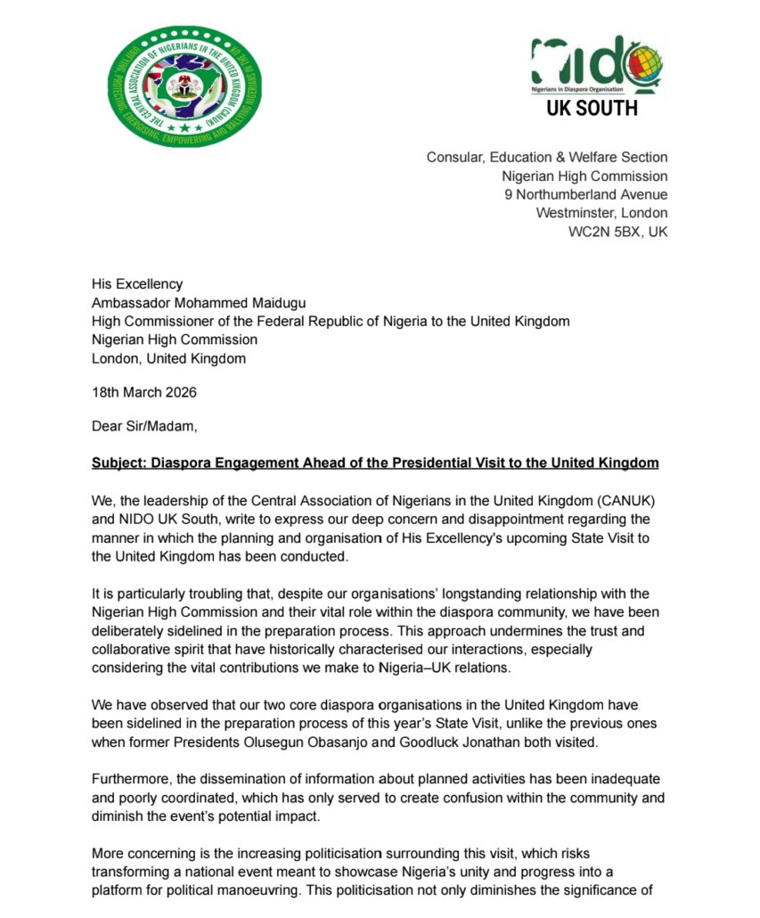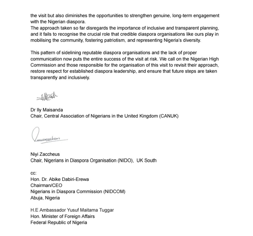 In the letter signed by the chairman of CANUK, Dr. lly Maisanda and Niyi Zachcheus of NIDO, the two organisations that prides itself of as having the largest membership number of Nigerians resident in the UK accused the embassy of sidelining reputable Nigerian diaspora organisations and lack of proper planning and communication throughout the activities preceding the landmark visit.